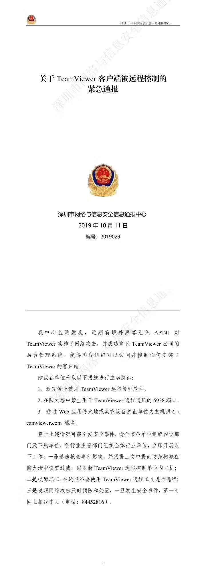 根據深圳市網(wǎng)絡(luò )與信息安全信息通報中心檢測發(fā)現,近期有境外黑客組織APT41對TeamViewer 實(shí)施了網(wǎng)絡(luò )攻擊,并成功拿下TeamViewer 公司的后臺管理系統,使得黑客組織可以訪(fǎng)問(wèn)并控制任何安裝了TeamViewer 的客戶(hù)端。